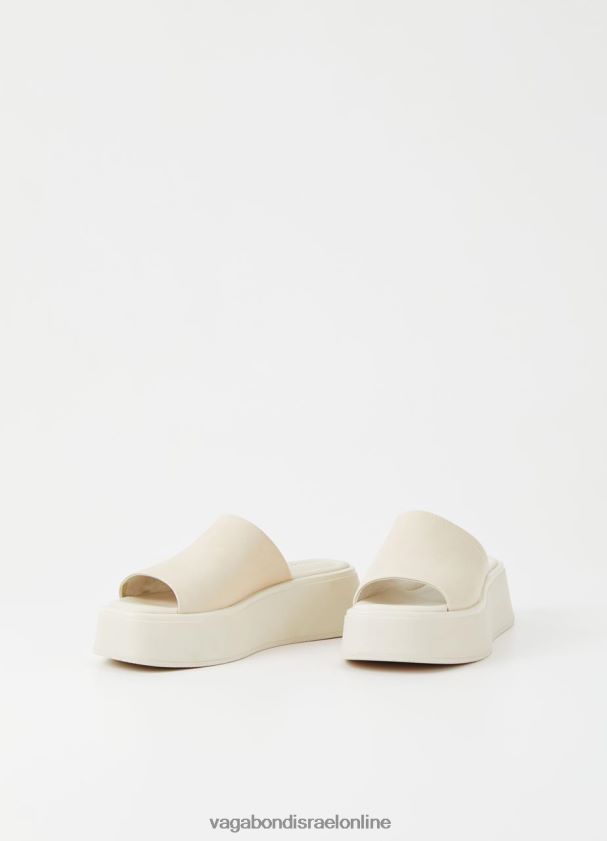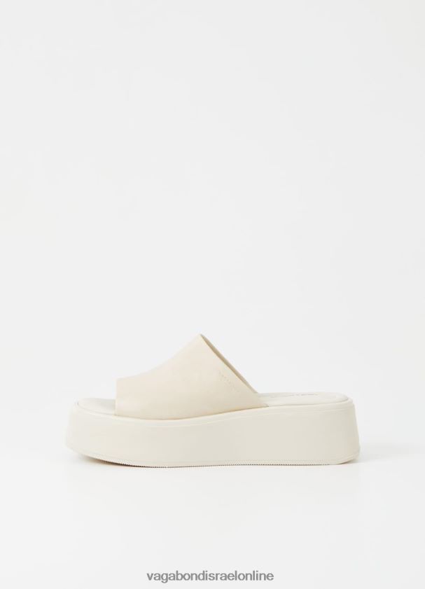 סנדלים מינימליים להחליק קורטני עשוי מעור חלק לבן, עם רצועת עור רחבה, מדרסים מרופדים ואצבעות מרובעות. החלקים העליונים על סוליות חיצוניות שטוחות ומוצקות בגודל 50 מ"מ.