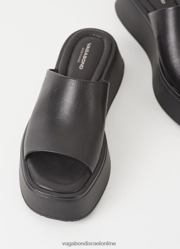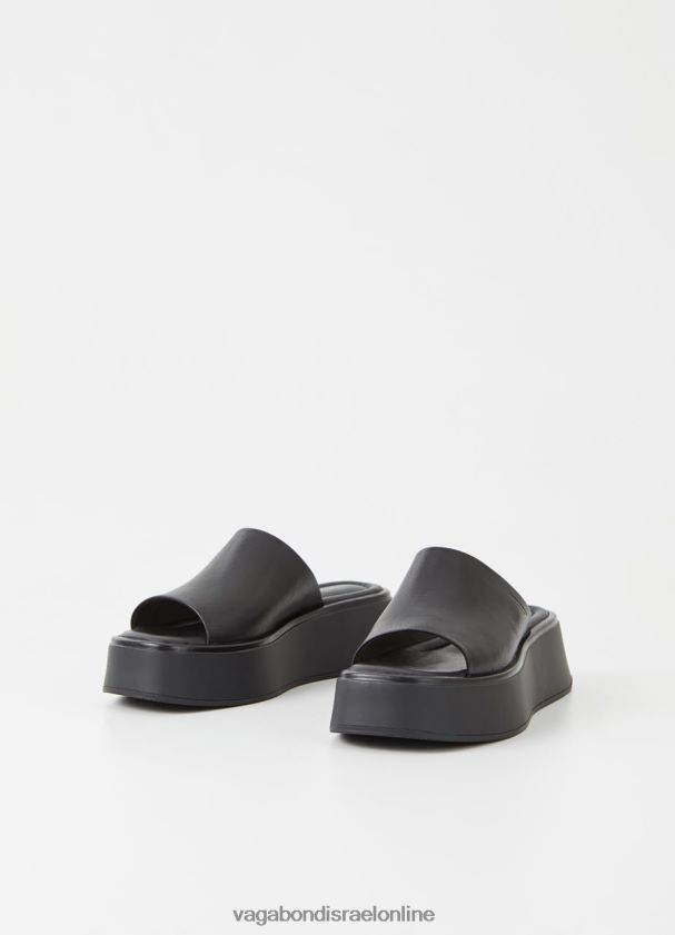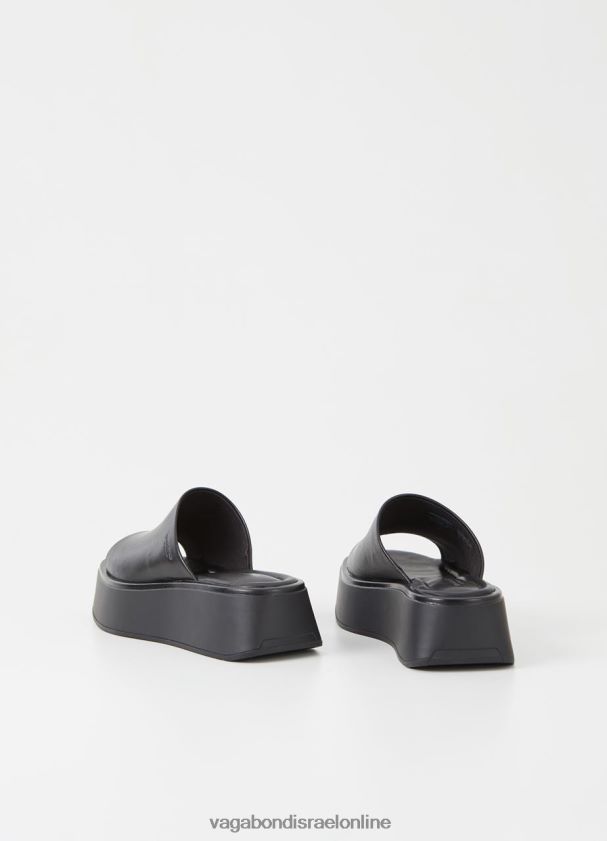 סנדלי החלקה מינימליים קורטני עשוי מעור שחור חלק עם רצועת עור רחבה, מדרסים מרופדים ואצבעות מרובעות. החלקים העליונים על סוליות חיצוניות שטוחות ומוצקות בגודל 50 מ"מ.